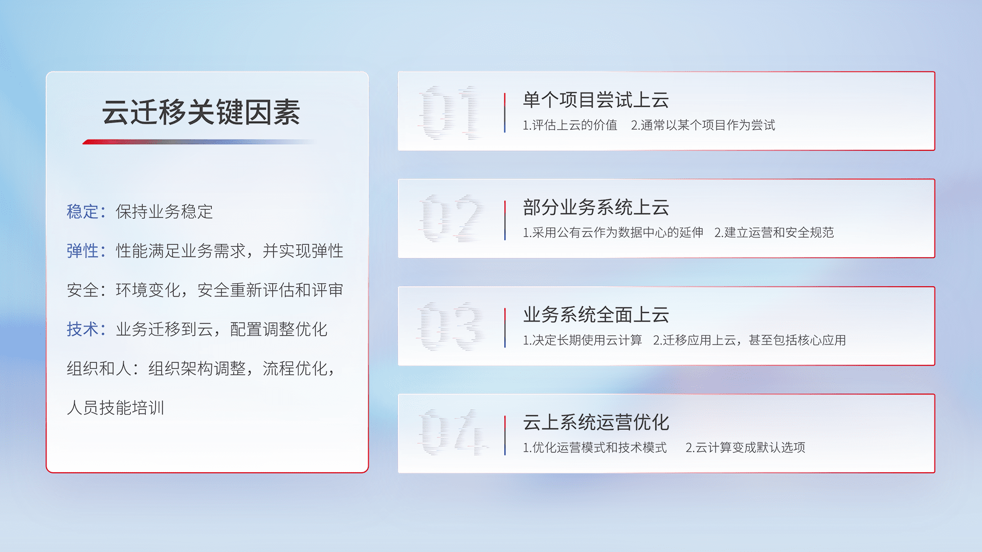 结合实际业务,,,从规划设计、、云平台选型、、、、云原生改造、、、、数据迁移、、、集成交付,,迁移全过程为客户识别最佳上云路径,,,,做好风险识别管理,,设计网络架构、、身份权限、、安全审计合规、、、操作审计、、日志审计、、、、监控告警策略、、、多站点容灾设计等,,对云上基础设施进行整体规划,,,提升IT治理水平,,,以满足弹性、、高可用、、、、高性能的需求。。