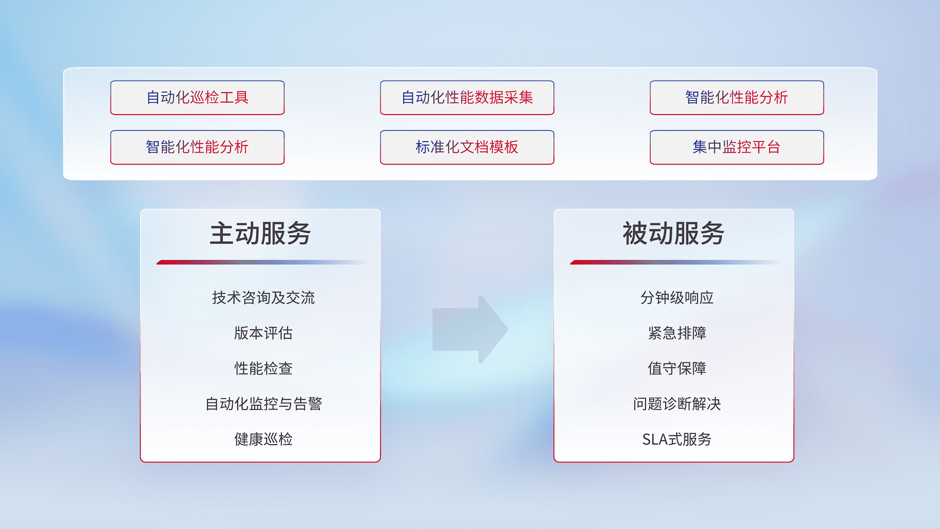 智能化工具和标准化文档,,保障服务质量,,,提供主动服务(包含技术咨询、、、、版本评估、、、、性能检查、、、、自动化监控与告警、、、健康巡检)和被动服务包含(分钟级响应、、、、紧急排障、、、、值守保障、、、问题诊断解决、、、SLA服务)。。。